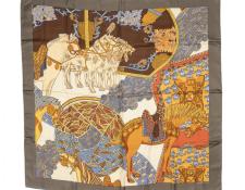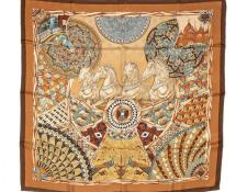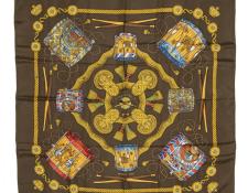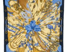 | 57 | Hermes | Scarf | Tan/Brown/Blue/Gold | 100% Twill Silk | “Trophees de Venise” by Julia Abadie | AA | ||