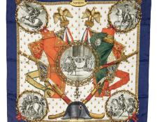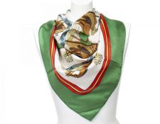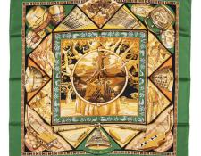| 58 | Hermes | Scarf | Moss Green/Yellow/Red/Blue | 100% Twill Silk | “Les Tambours” by Joachim Metz | AB | ||