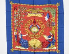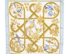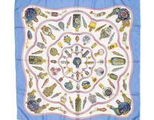 | 56 | Hermes | Scarf | Light Blue/Gold/White | 100% Twill Silk | “Caraibes” by Christiane Vauzelles | AB | ||