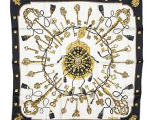 | 279 | Hermes | Scarf | Black/White/Gold | 100% Twill Silk | “Les Cles” by Cathy Latham | AA | ||