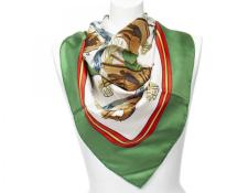 | 280 | Hermes | Scarf | Green/Flashy Red/Gold | 100% Twill Silk | “Ecuries” by Philippe Ledoux | A | ||