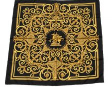| 60 | Hermes | Scarf | Black/Gold | 100% Twill Silk | “Les Tuileries” by Joachim Metz | Box | AA | |