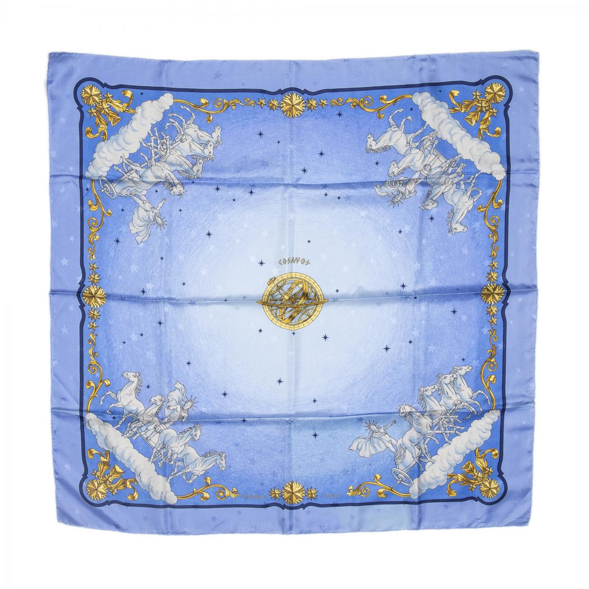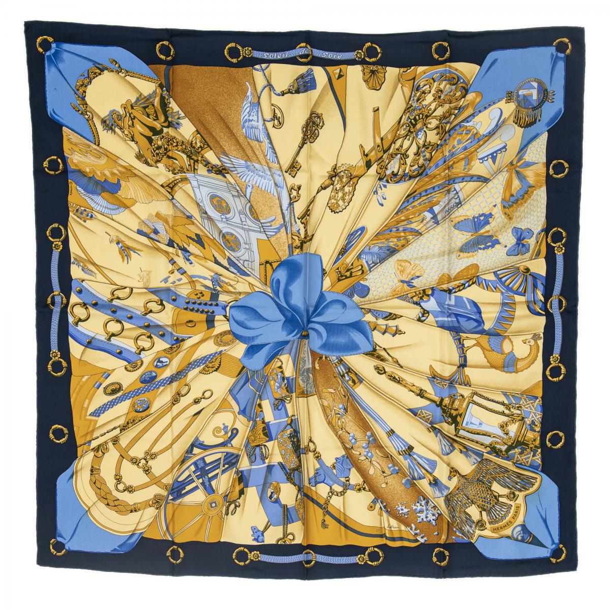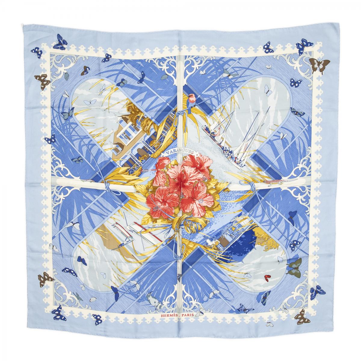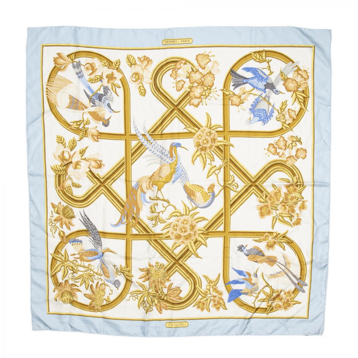 | 56 | Hermes | Scarf | Light Blue/Gold/White | 100% Twill Silk | “Caraibes” by Christiane Vauzelles | AB | ||