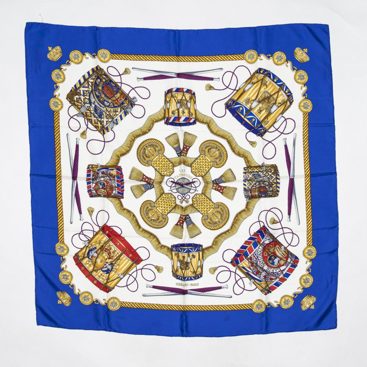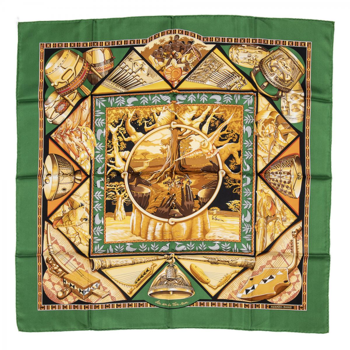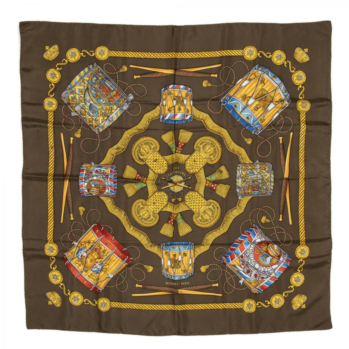 | 58 | Hermes | Scarf | Moss Green/Yellow/Red/Blue | 100% Twill Silk | “Les Tambours” by Joachim Metz | AB | ||