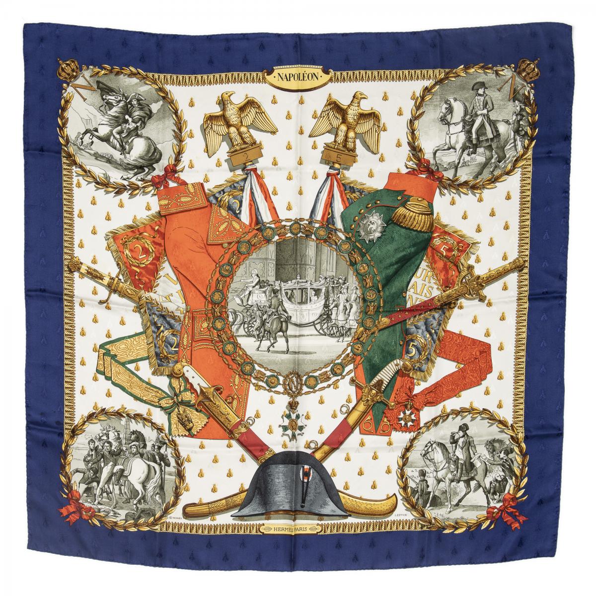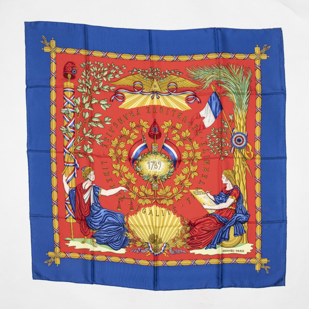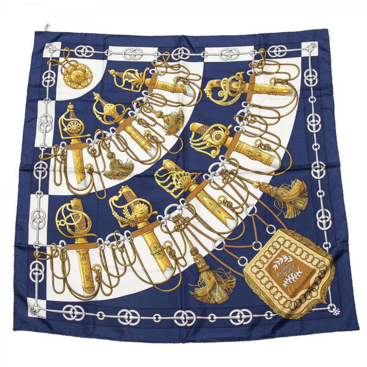 | 278 | Hermes | Scarf | Royal Blue/Red/Gold | 100% Twill Silk | “1798” | AA | ||