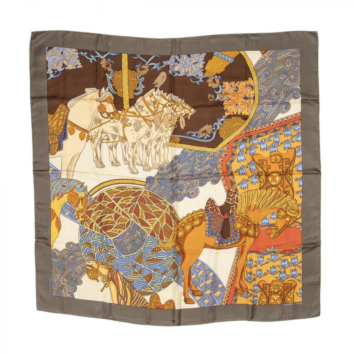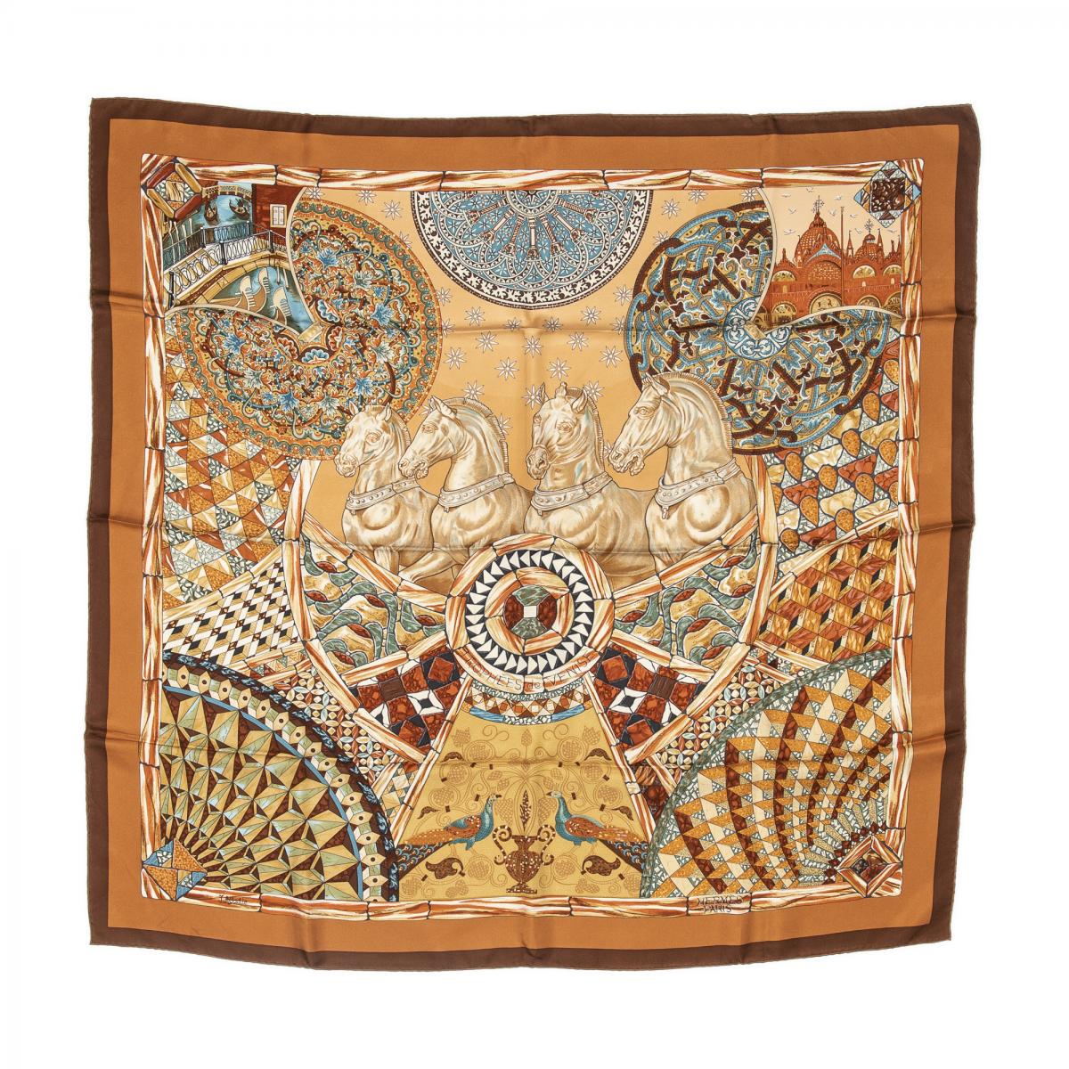 | 57 | Hermes | Scarf | Tan/Brown/Blue/Gold | 100% Twill Silk | “Trophees de Venise” by Julia Abadie | AA | ||