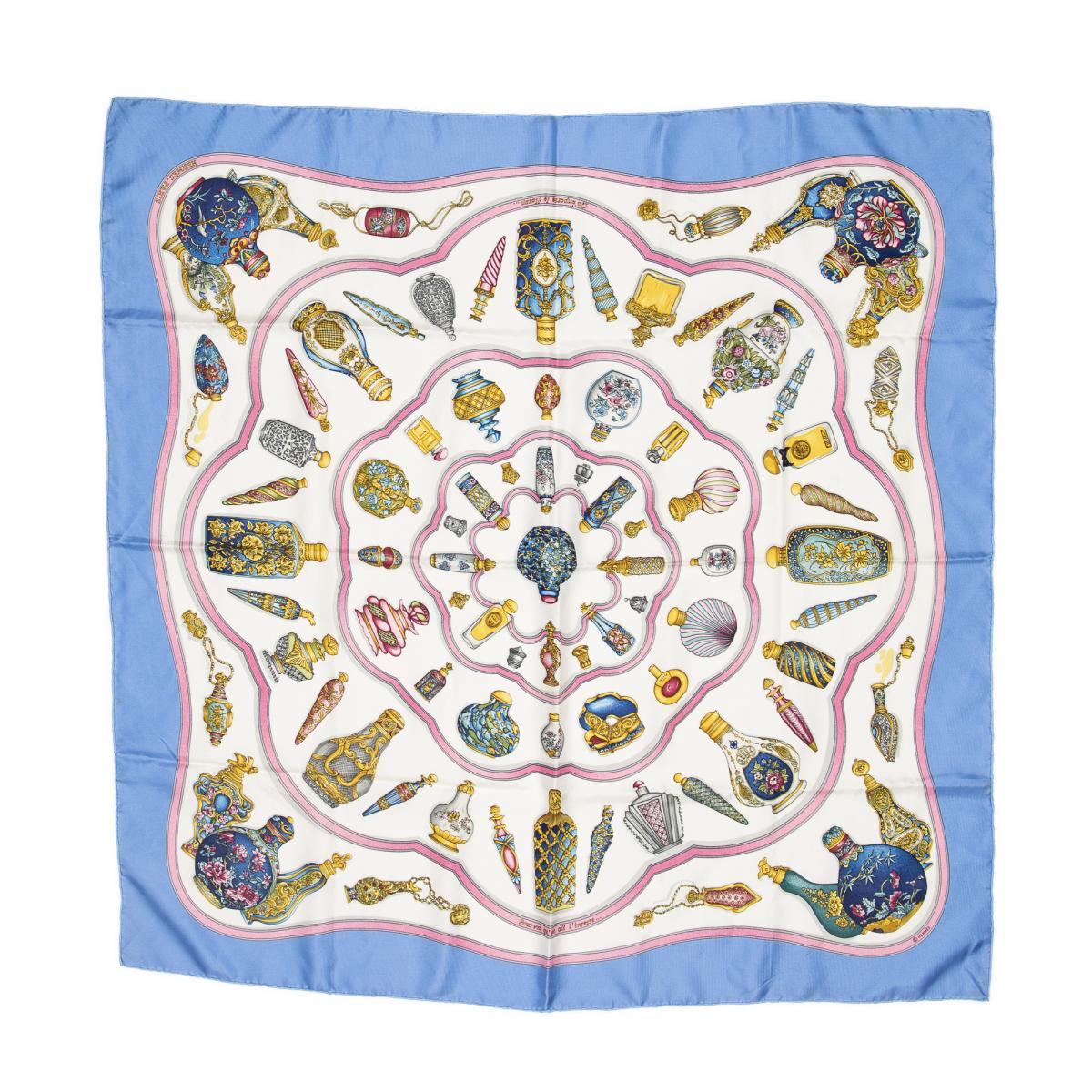 | 277 | Hermes | Scarf | Light Blue/Pink/Ivory | 100% Twill Silk | “Qu’Import le Flacon” by Catherine Baschet | AB | ||