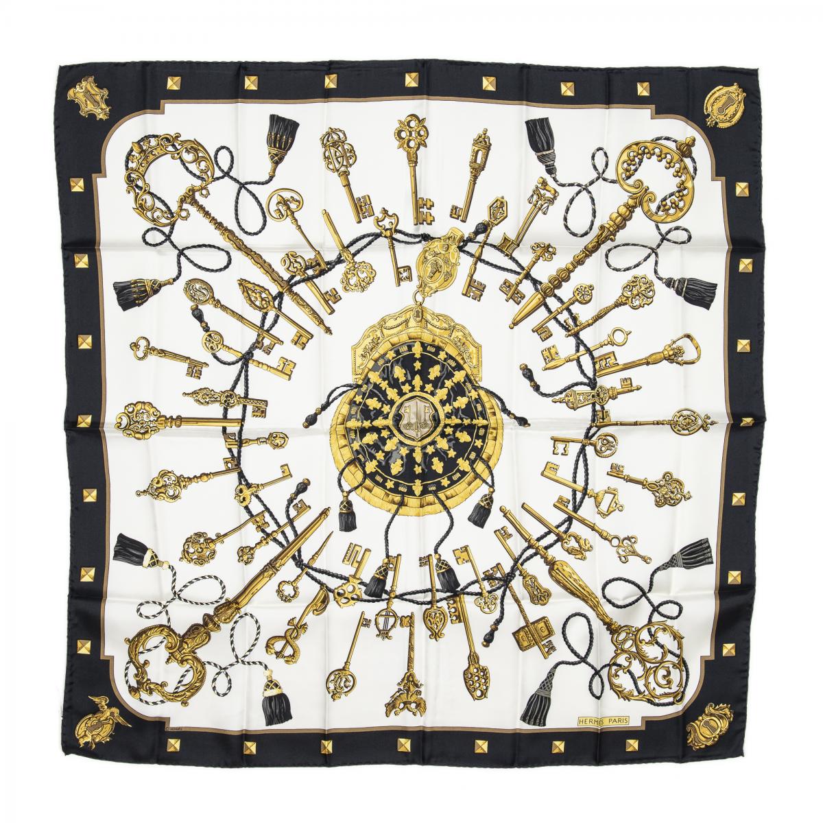 | 279 | Hermes | Scarf | Black/White/Gold | 100% Twill Silk | “Les Cles” by Cathy Latham | AA | ||