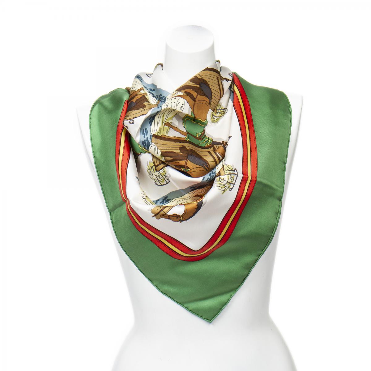 | 280 | Hermes | Scarf | Green/Flashy Red/Gold | 100% Twill Silk | “Ecuries” by Philippe Ledoux | A | ||