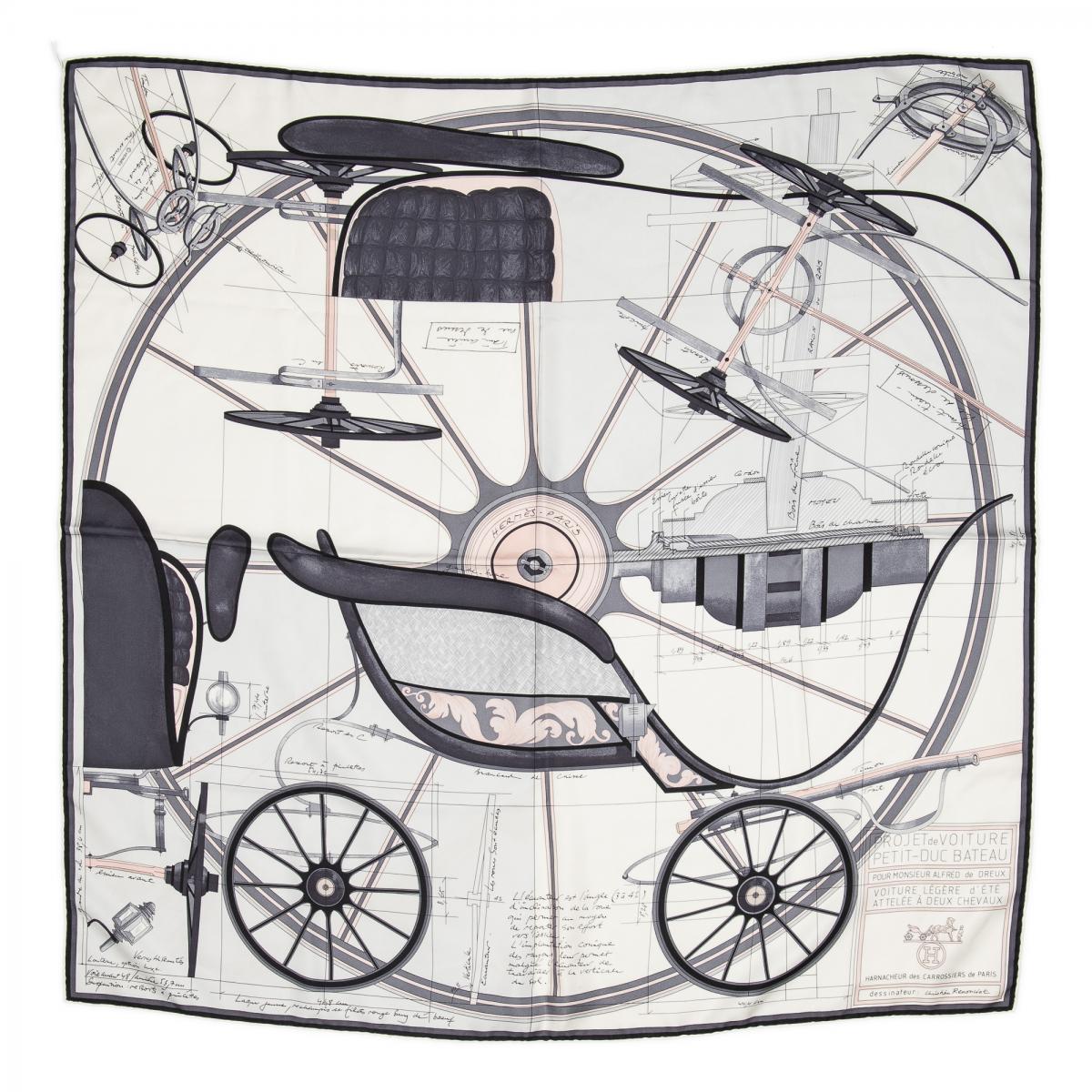 | 59 | Hermes | Scarf | Black/Grey/White | 100% Twill Silk | Projet de voiture, petit-duc bateau by Christian Renonciat | AA | ||