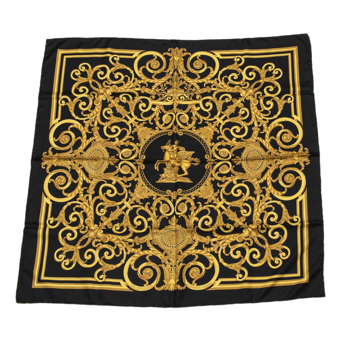 | 60 | Hermes | Scarf | Black/Gold | 100% Twill Silk | “Les Tuileries” by Joachim Metz | Box | AA | |